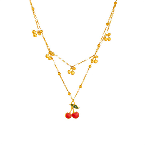 Collar con colgante de acero inoxidable de doble cadena con cuentas de oro cereza y gota de aceite para mujer, joyería versátil de moda